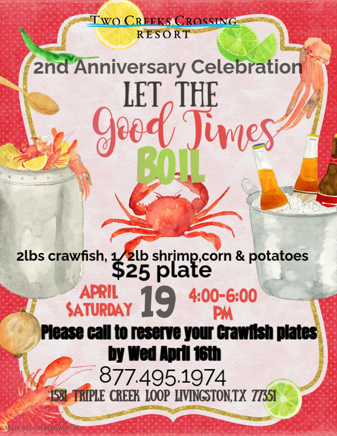 Crawfish Boil – 4-6pm $25/plate includes 2lbs crawfish, 1/2lb shrimp, corn and potatoes! Must preorder! Call 877.495.1974
