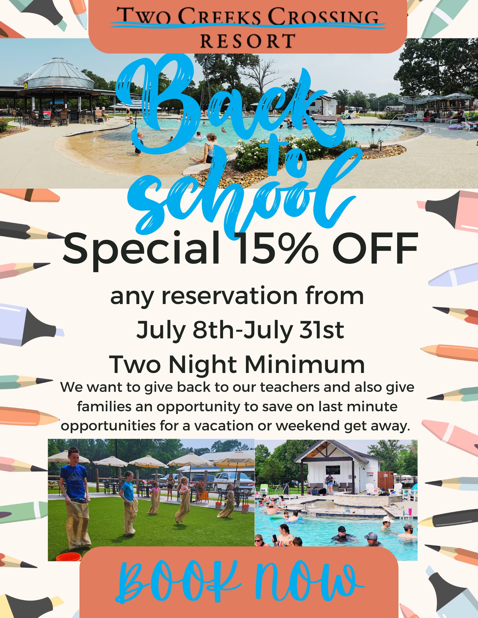 Book a reservation during July 8th ,2024 to July 31, 2024, and get 15% off!! When booking online don’t forget to add the Back to School 15% package discount!