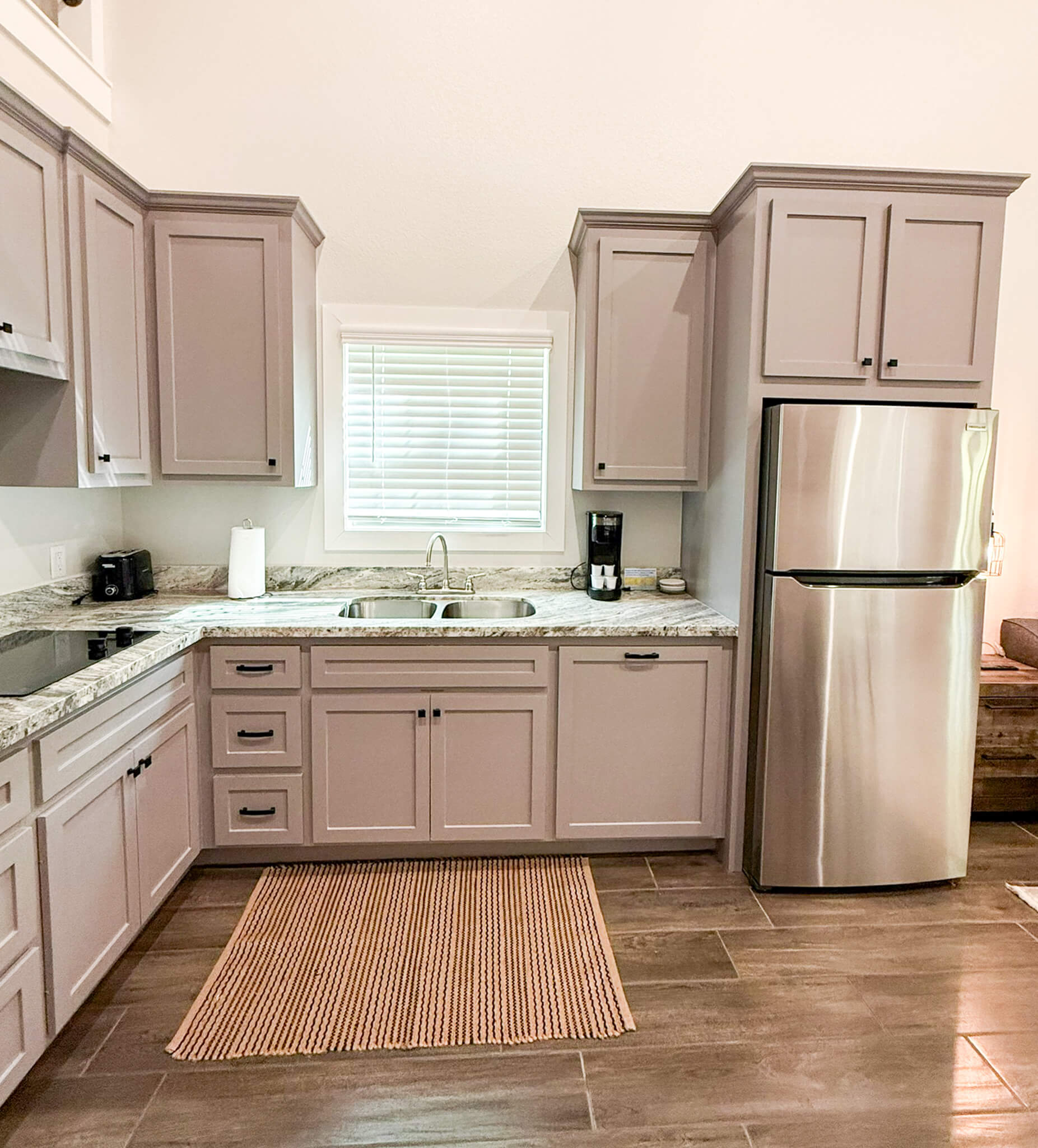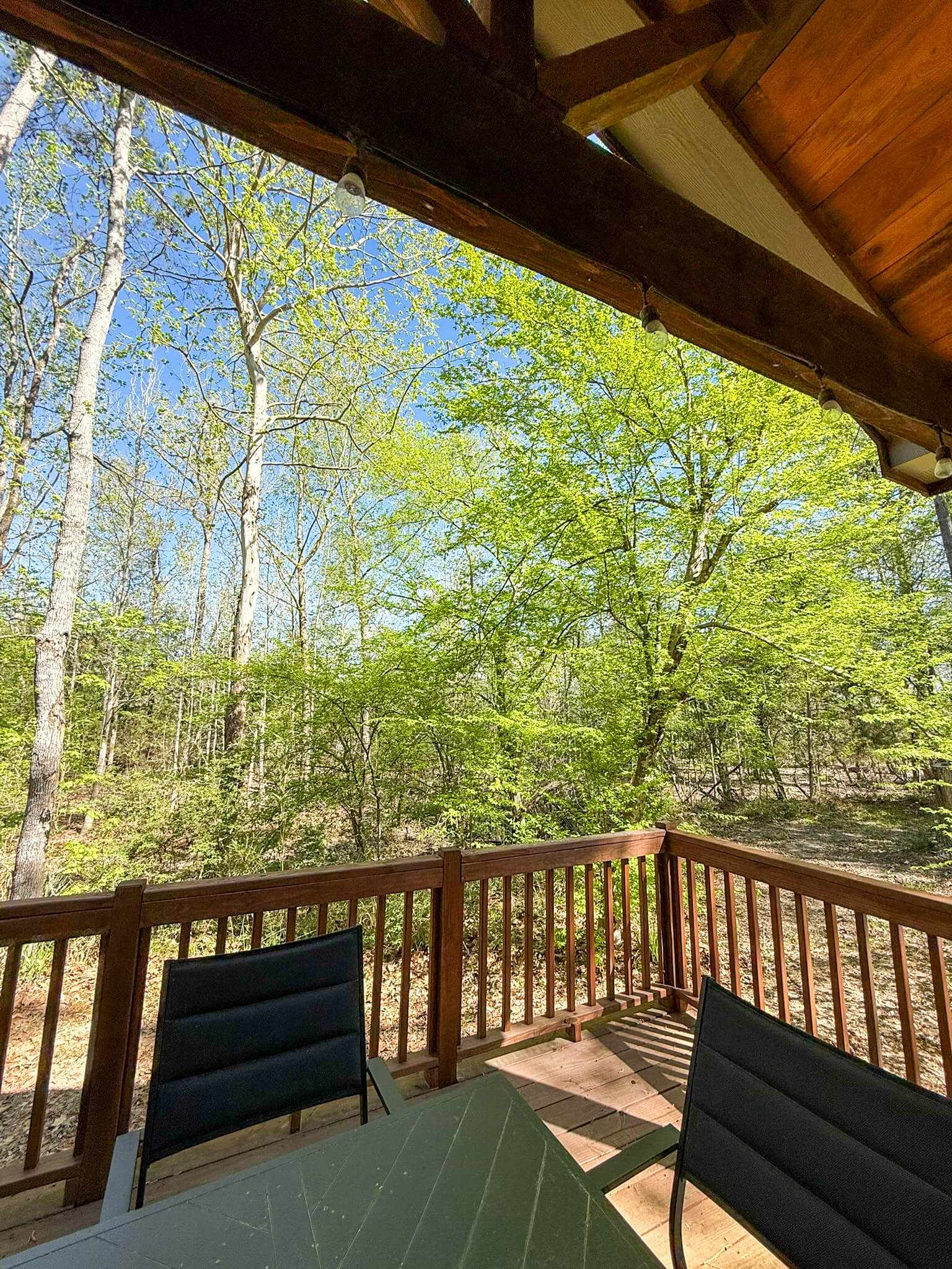 The back porch, just off the bedroom, invites you to relax and enjoy the tranquil surroundings. Inside, you’ll find a fully equipped kitchen and a comfortable living area, plus a propane grill for outdoor meals. Whether you’re exploring the beauty of the woods or unwinding in the cabin, Wanderer’s Cabin offers a peaceful, homey atmosphere for creating unforgettable memories.