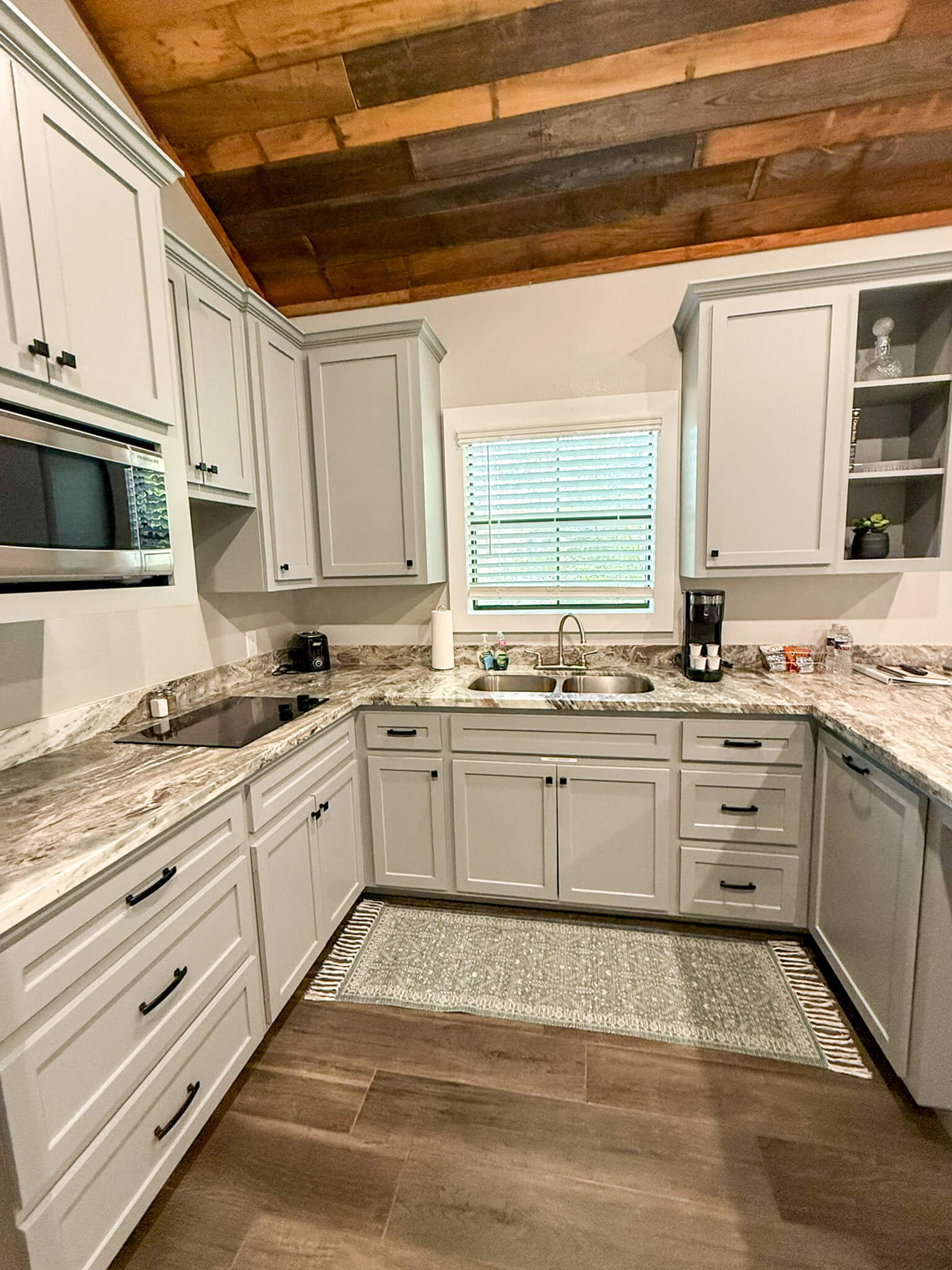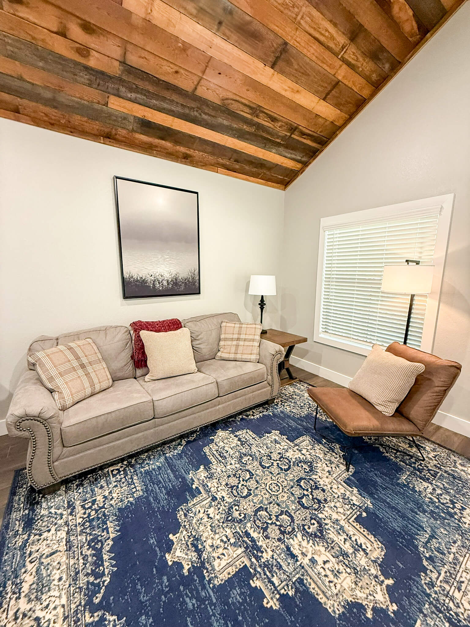 With a full kitchen and a propane gas grill, you can enjoy home-cooked meals indoors or out. The living area also features a couch that folds out into an additional bed, making it a great choice for families. Whether you’re lounging on the porch or curling up inside, Eagle’s Nest promises a memorable and relaxing experience.