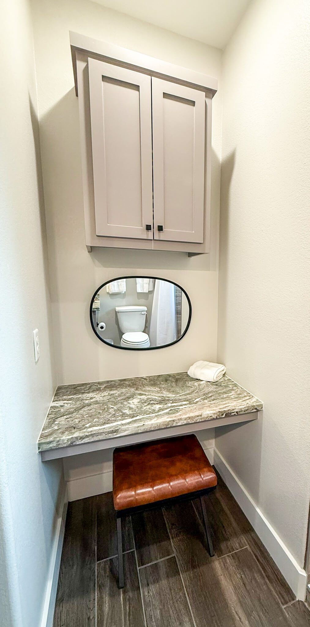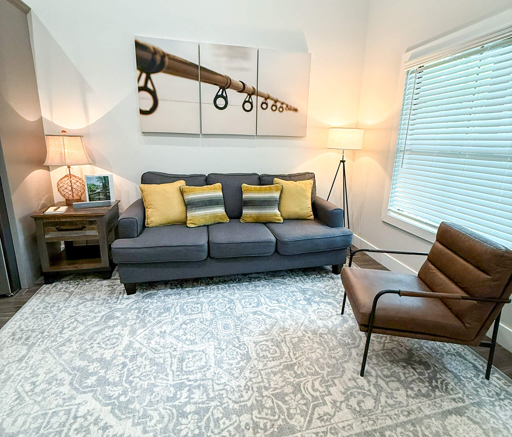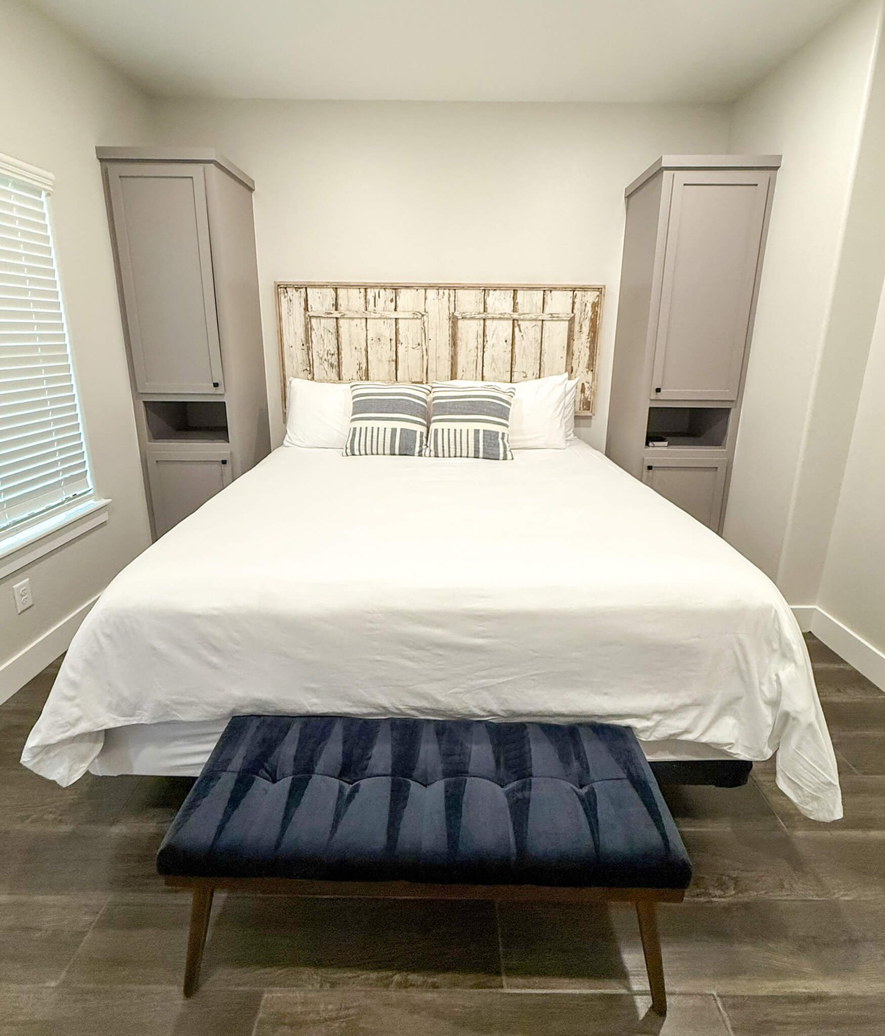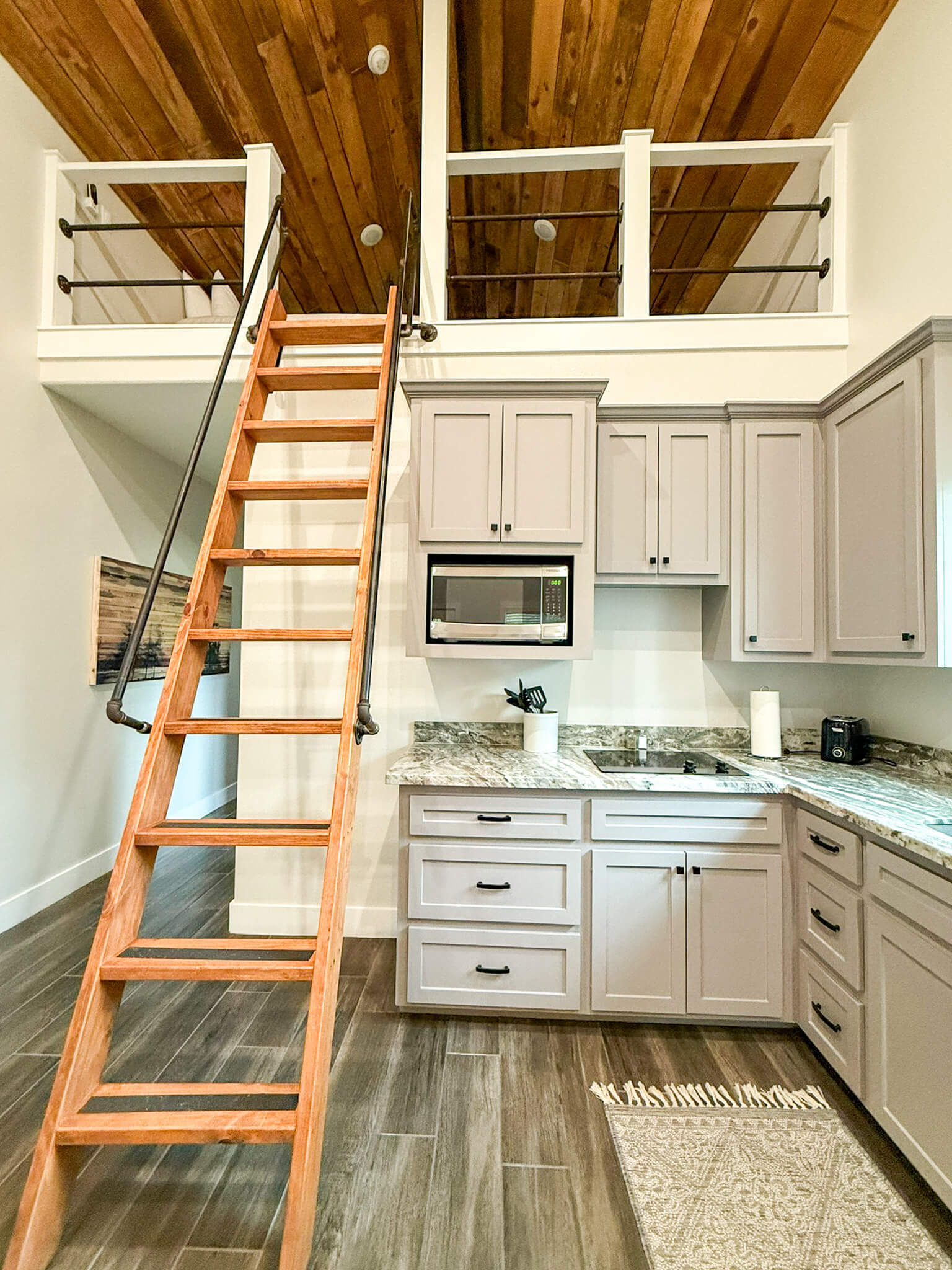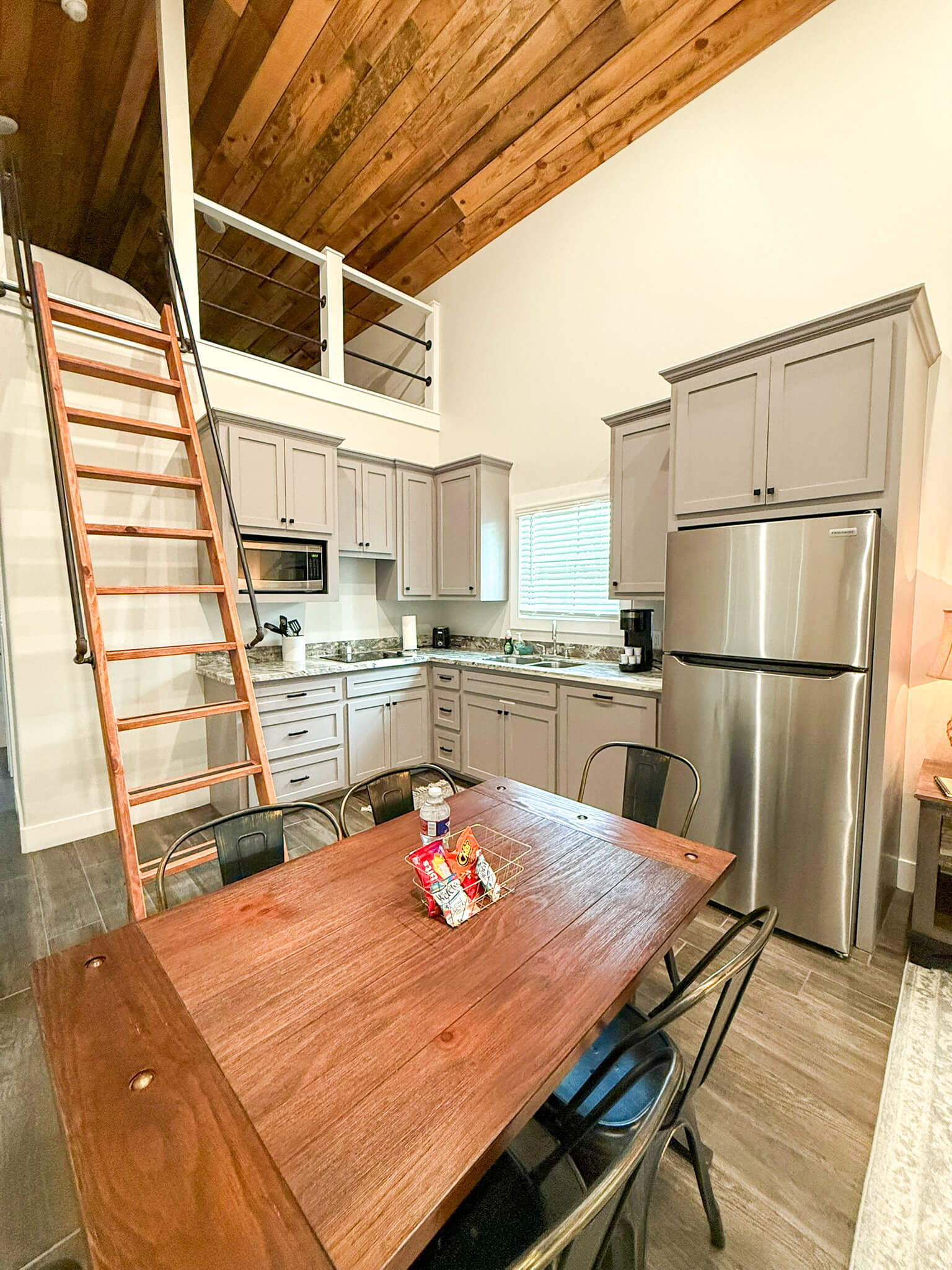 The bedroom opens to a peaceful back porch overlooking the creek—perfect for morning coffee or evening stargazing. Inside, the full kitchen makes it easy to stay for a weekend or even a couple of weeks, and the 300-square-foot loft provides extra sleeping space for the kids or guests. With open space to roam and scenic trails nearby, your pup will love it just as much as you do.